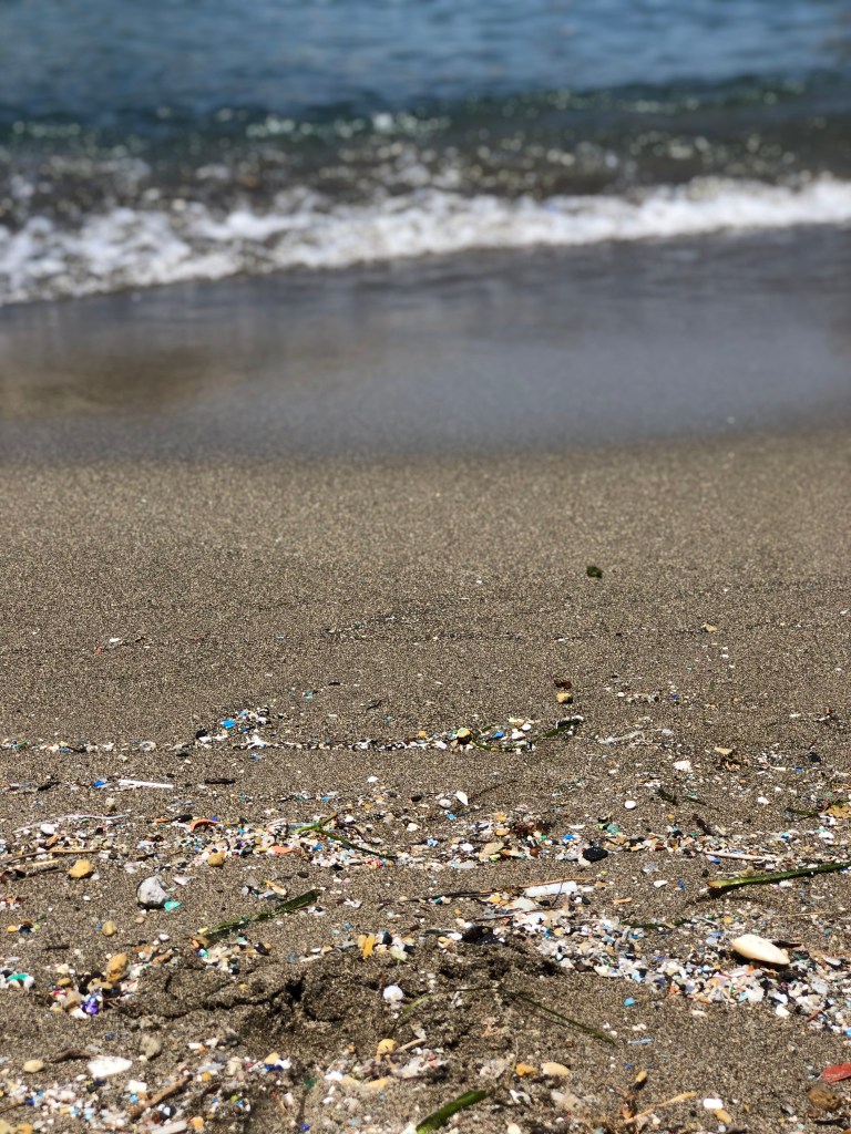 There’s a small beach where you can access the water easily, but part of it is sadly covered with microplastic.